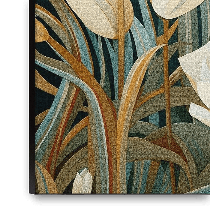 Une peinture numérique colorée d'un champ de tulipes. Cette œuvre s'inspire des formes et de la palette de couleurs du mouvement Art nouveau. L'œuvre donne un aspect chaleureux et classique à votre intérieur !