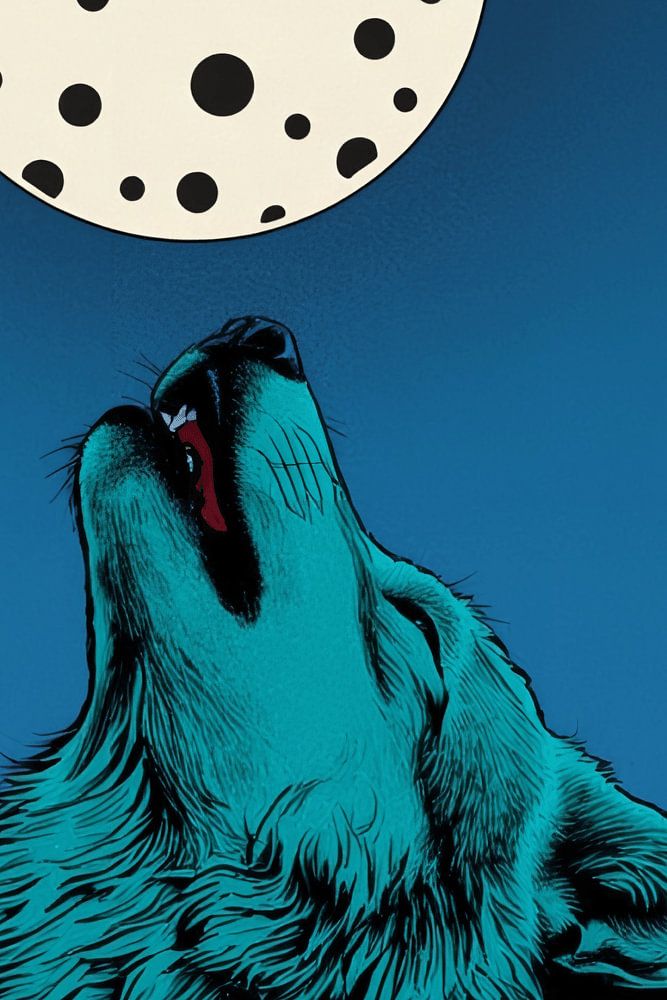 Illustration d'un loup bleu qui hurle à la lune avec des taches noires sur un fond bleu foncé.