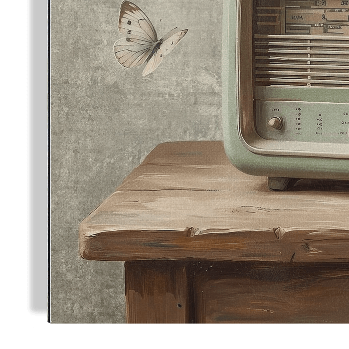 Radio à transistor des années 1950, d'un vert neuf, qui brille doucement dans une lumière naturelle chaude. Un rouge-gorge, à la poitrine orange vif, est assis au sommet du poste de radio. Autour de lui, plusieurs papillons virevoltent dans de subtiles couleurs pastel. À l'arrière-plan, un luxuriant bouquet de fleurs séchées dans des tons terreux, avec une texture fine et des ombres légères. Composition dans une ambiance rétro calme, détails poussés, coups de pinceau doux, harmonie des couleurs sophistiquée, style pittoresque et rêveur.