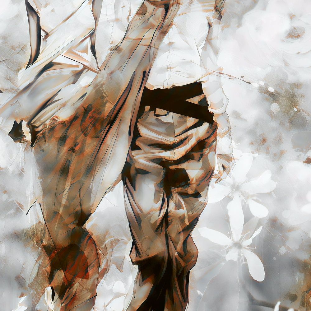 Deux dames élégamment vêtues s'avancent vers vous. La première porte un long châle flottant, une jupe longue et ajustée et un chemisier blanc. Elle porte également un foulard dans les cheveux. Elle a la démarche d'un mannequin : un pied exactement devant l'autre. La dame qui se trouve derrière elle la suit à une courte distance. Elle porte une jupe longue drapée. Elle porte également un chemisier blanc par-dessus, avec un chapeau blanc. Elle a la même démarche. On dirait que les deux dames marchent vers vous depuis un rêve, alors qu'elles traversent un grand nuage de différentes fleurs blanches, deux sortes de roses blanches et de petites fleurs blanches. Le feuillage qui les entoure est d'une couleur chaude et entoure les fleurs blanches. Peut-être rêvent-elles d'une carrière de mannequin ou le sont-elles déjà, peut-être est-ce aussi leur première apparition, qui sait. Les couleurs de cette œuvre surréaliste sont le marron, l'orange, le blanc et le noir, ainsi que de nombreuses nuances intermédiaires.