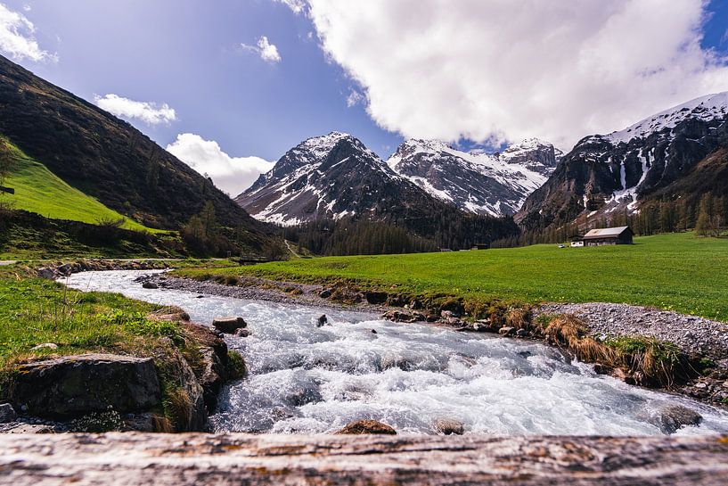 Photo de paysage de la rivière suisse 'Sertigbach' ;. On voit clairement le fort courant de la rivière qui descend. L'eau se fraye un chemin entre les gros blocs de pierre. La photo a été prise depuis un pont en bois qui enjambe la rivière. On peut encore voir la poutre en bois du pont au premier plan de la photo. À l'arrière-plan, on peut voir les sommets enneigés des montagnes et l'herbe d'un vert éclatant. C'est un beau contraste au printemps. Sertig, canton des Grisons en Suisse.