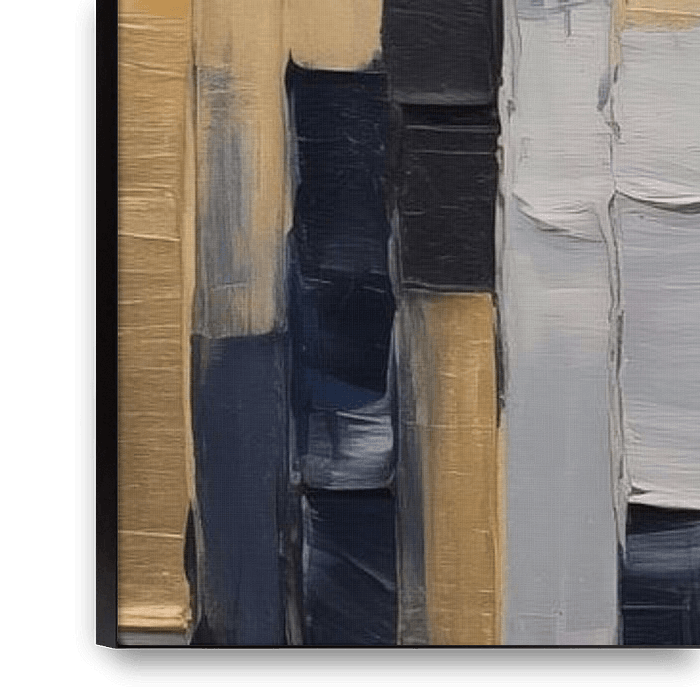 A Touch of Gold #XLIII est une peinture numérique de style expressionniste abstrait. La palette de couleurs est composée de différentes nuances de bleu généreux, de blanc et d'or. L'œuvre donne un aspect rustique et moderne à votre intérieur !