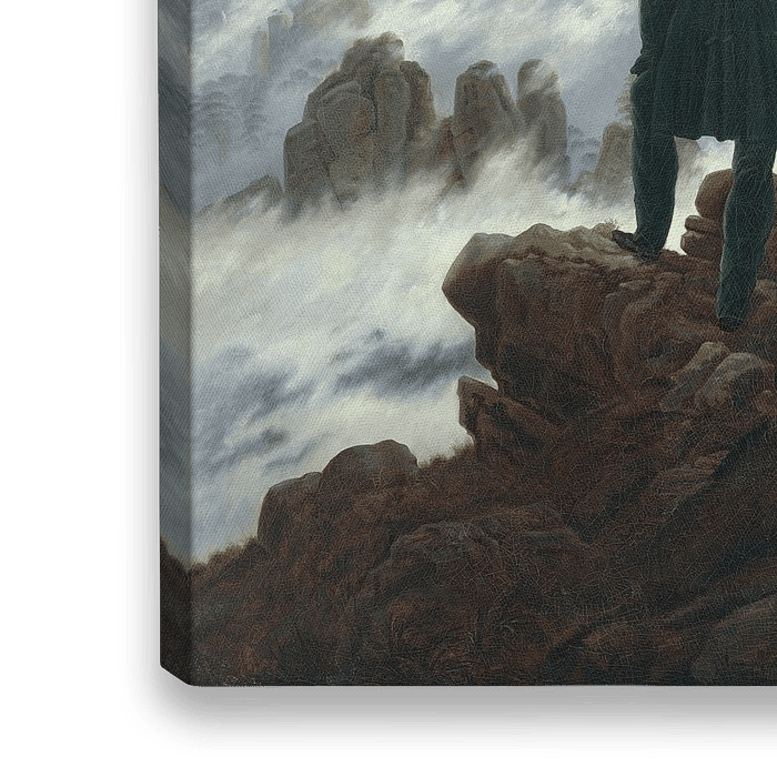 Le randonneur se tient comme une figure de dos au centre de la composition. Il regarde une mer de brouillard presque impénétrable au milieu d'un paysage rocheux - une métaphore de la vie comme un voyage inquiétant vers l'inconnu.