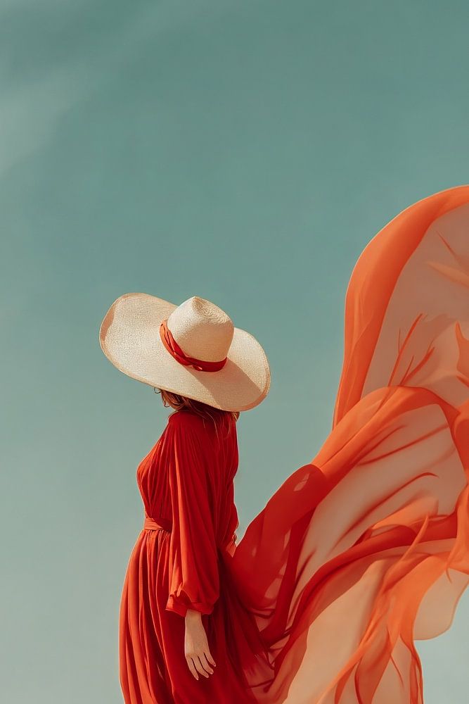 Une femme vêtue d'une robe rouge fluide se tient debout sur un fond sableux, sous un ciel turquoise serein. La robe danse au gré du vent telle une flamme ardente, tandis qu'un chapeau d'été beige complète la silhouette. La composition dégage un équilibre parfait entre mouvement et sérénité, les intenses teintes rouge orangé contrastant magnifiquement avec la douceur et la rêverie du fond.