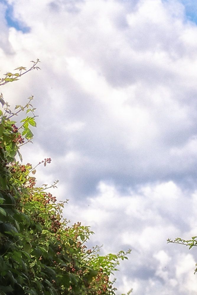Un verger de framboisiers sous le ciel. La lumière du soleil, les nuages et le verger en train de cueillir des framboises en font une scène magnifique à regarder. Un air d'été et la verdure de la nature, Mère Nature à son meilleur !