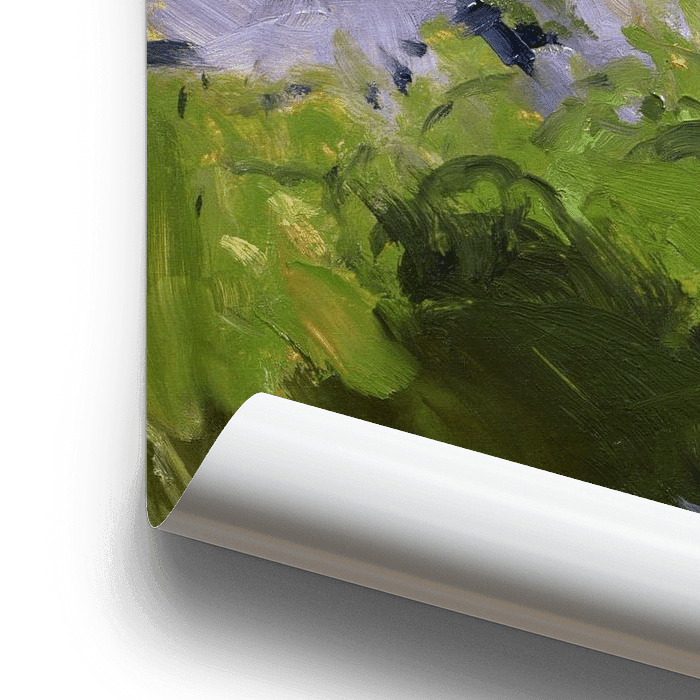 Rivage recouvert de vignes, île de Monhegan (1913), peinture de George Wesley Bellows. L'original se trouve à la Smithsonian Institution. Nature, paysage, peinture, Rivage, George Wesley Bellows, vieux maître, mer, paysage marin, horizon, couleur bleue, verte, pourpre.