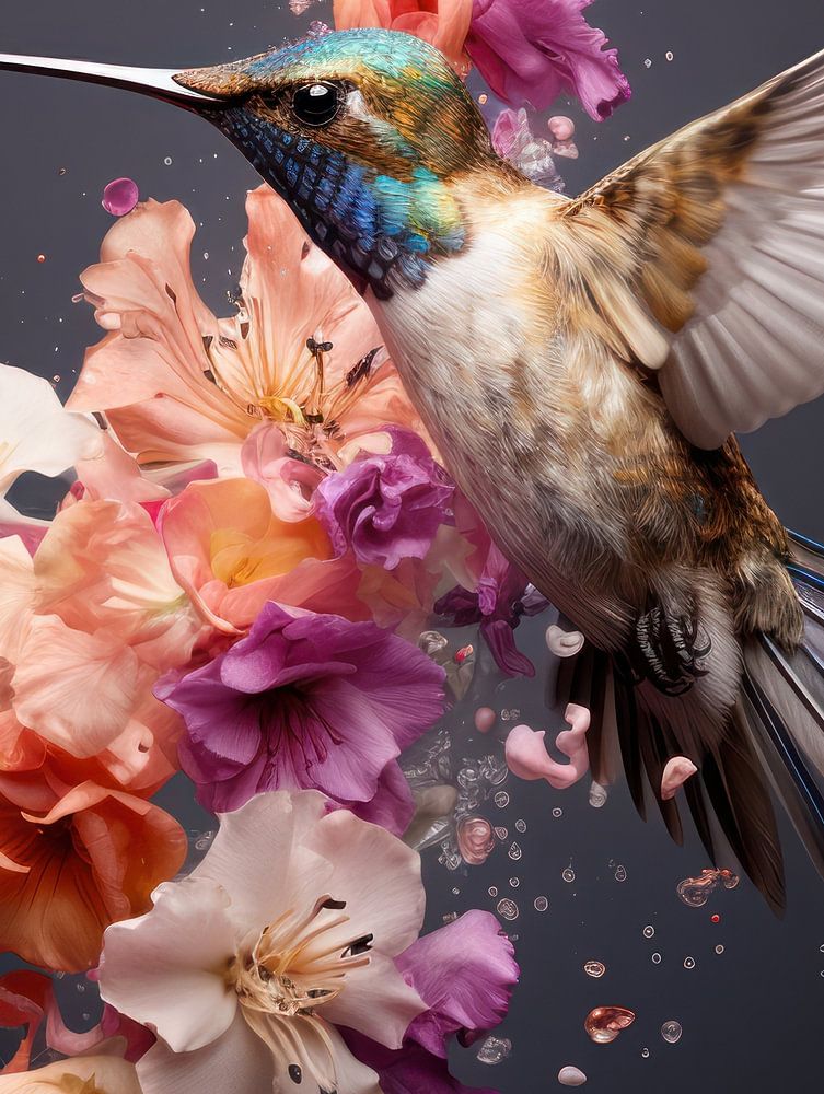 Flight of Refinement" est une représentation éthérée d'un colibri en plein vol, entouré d'une cascade de fleurs délicates. Les fins détails des plumes et les subtiles transitions de couleurs créent une impression de mouvement et de légèreté. Les fleurs, qui vont des pastels doux aux tons corail vibrants, semblent presque danser dans…