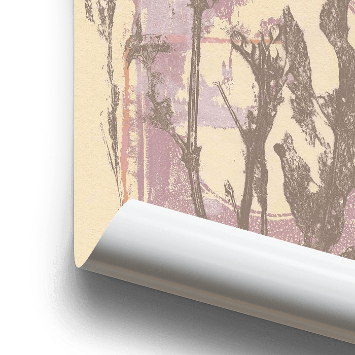 Art botanique moderne mixte semi-abstrait. Collage de formes géométriques abstraites et de monotypes de vraies feuilles, plantes et fleurs. Ambiance calme, élégante et naturelle. Couleurs pastel claires, textures douces - art pour un style de vie romantique, japonais, scandinave, basique, design, bohème, rétro, éclectique ou…