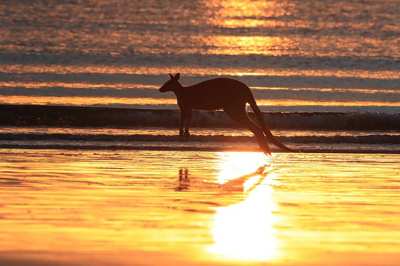 Achetez cette photo kangourou sur la plage au lever du soleil, mackay, queensland du nord, australie par Frank Fichtmüller sur toile, aluminium, ArtFrame ou photographie (encadrée), impression d'art en haute qualité et tout format.
