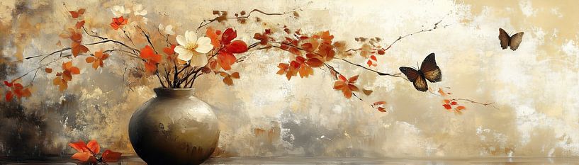 nature morte florale | Vase Flutter - Cette peinture florale représente une nature morte japandi avec un vase rond mat et de longues branches aux feuilles rouge orangé et une fleur couleur crème, sur un fond beige-gris doux où deux papillons virevoltent légèrement. Une peinture florale moderne, une peinture de fleurs et une nature morte florale qui attirera tous les regards dans un intérieur moderne.