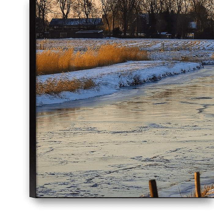 paysage d'hiver à Buren, en Gueldre, où l'on voit la rivière Korne, à l'heure dorée du matin