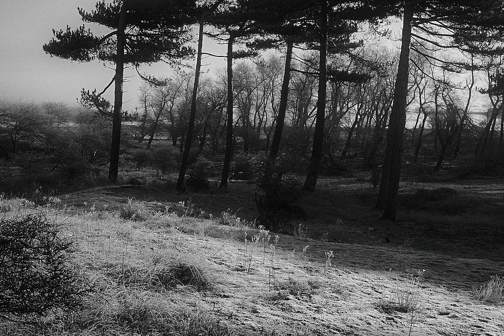 Paysage atmosphérique photographié en noir et blanc avec un petit arbre au premier plan opposé à une forêt sombre à l'arrière-plan. Paysage de dunes près de Bloemendaal