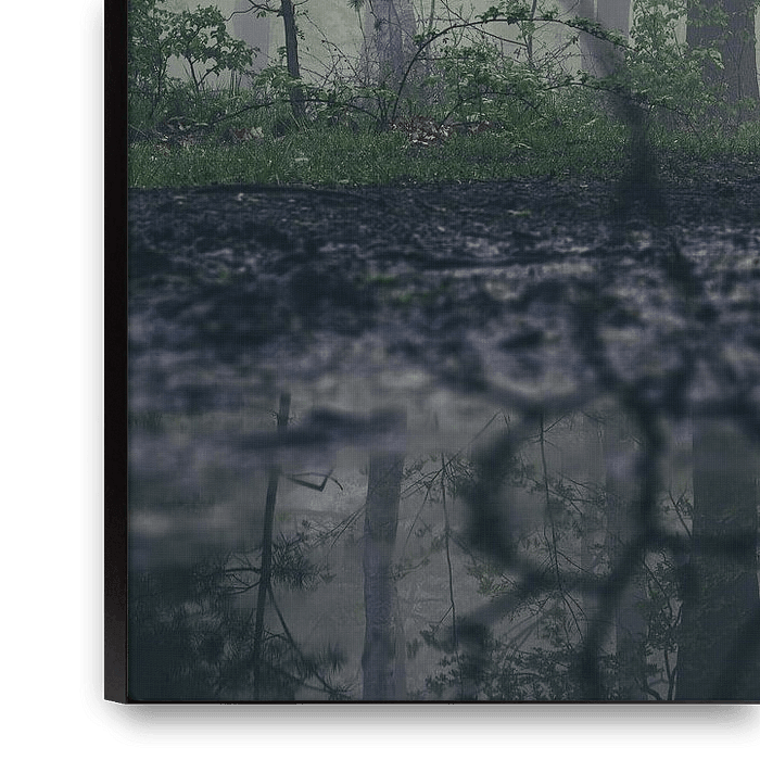 paysage à Leersum, Utrecht, où la brume s'accroche entre les arbres de la forêt, et où l'on voit le reflet dans une flaque d'eau