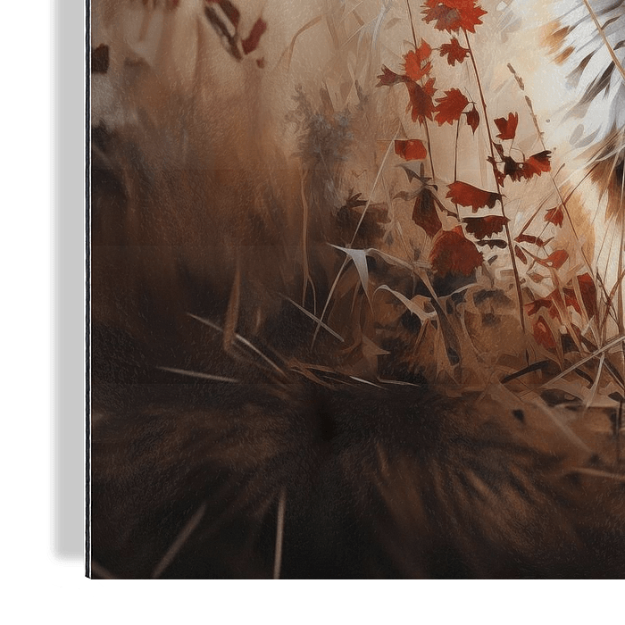 Rendu photographique d'une peinture à l'aquarelle représentant un jeune renard au milieu de feuilles et d'herbes d'automne décolorées. Les tons bruns donnent à cette image une belle touche automnale.