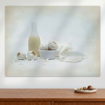 Nature morte avec de l'ail, du lait et des nuances de crème . par Saskia Dingemans Awarded Photographer