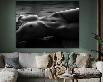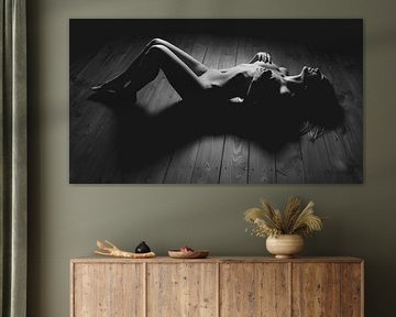 "Embers of Stillness - Light on Wood" - femme nue allongée sur un sol en bois par Retinas images