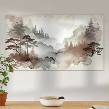 • Photo de nos clients: Fleur de cerisier devant des sommets montagneux brumeux Panorama du Japandi par Digitale Schilderijen, sur toile