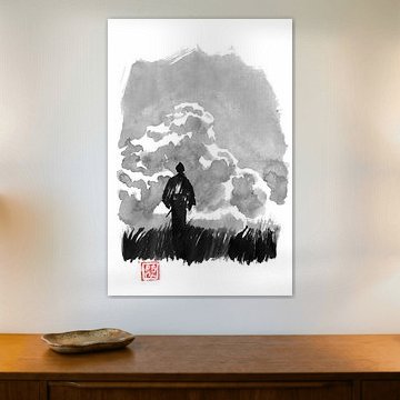 • Photo de nos clients: Fleur de cerisier devant des sommets montagneux brumeux Panorama du Japandi par Digitale Schilderijen, sur toile