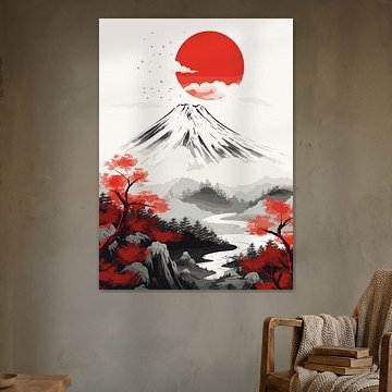 • Photo de nos clients: Fleur de cerisier devant des sommets montagneux brumeux Panorama du Japandi par Digitale Schilderijen, sur toile