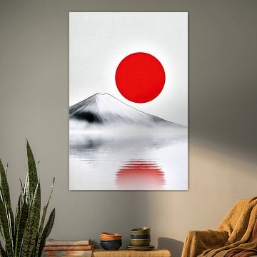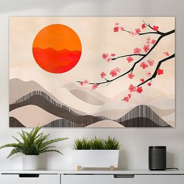 • Photo de nos clients: Fleur de cerisier devant des sommets montagneux brumeux Panorama du Japandi par Digitale Schilderijen, sur toile