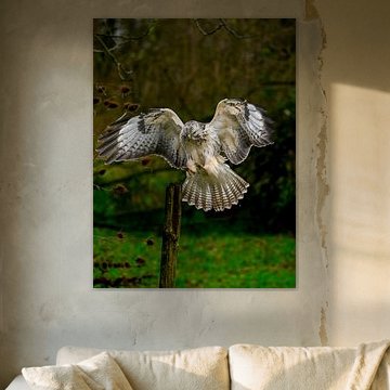 Placez vos œuvres de rapaces à environ 1,50 m du sol pour créer un contact visuel naturel. Les yeux perçants des oiseaux captent ainsi mieux l'attention. Cette hauteur convient particulièrement bien pour Harfang des neiges (Bubo scandiaca), dont le regard intense de la chouette harfang crée une présence forte dans votre intérieur.