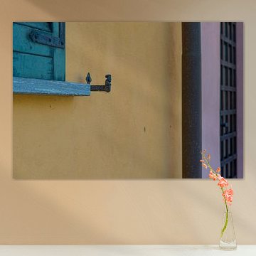 Mur abîmé par les intempéries avec une fenêtre avec des rideaux et une croix avec une statue de Marie par Regina Elise