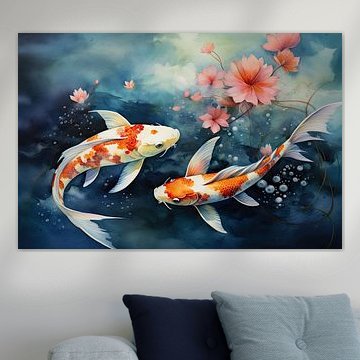 Deux carpes koï parmi des nénuphars aquarelle par Vlindertuin-Art